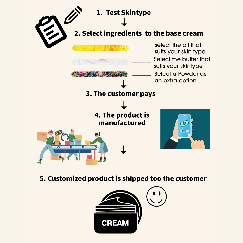 My business idea will provide personalised/customised solutions using natural and organic ingredients, avoiding toxic chemicals. I do this by creating a system where people get more advice with a skin type scan. After this scan, a recommendation comes out on which skin type they have and what ingredients they need to improve their skin. With the ingredients, a specialised beauty product is created for that person.