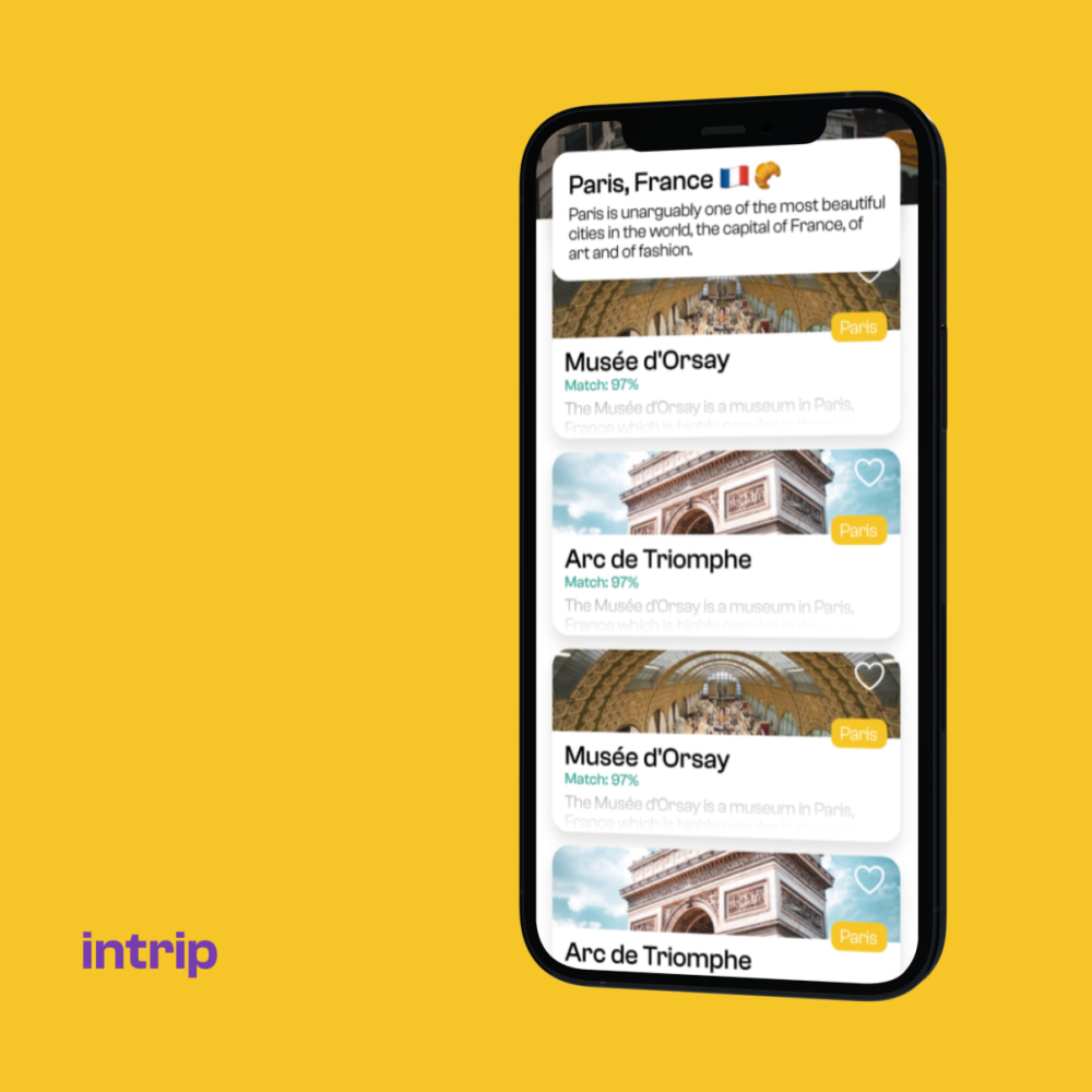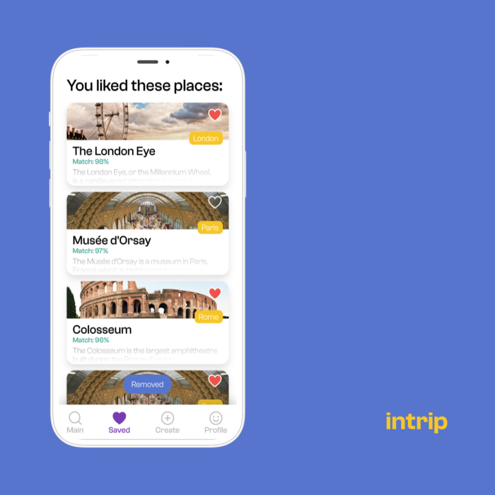 intrip is a search engine that allows users to find desired locations to travel based on their social media. The neural network analyses each post and highlights of the user on their social media like Instagram and Facebook. Depending on these results, the algorithm finds the best possible matches - places (sports activities, museums, restaurants).