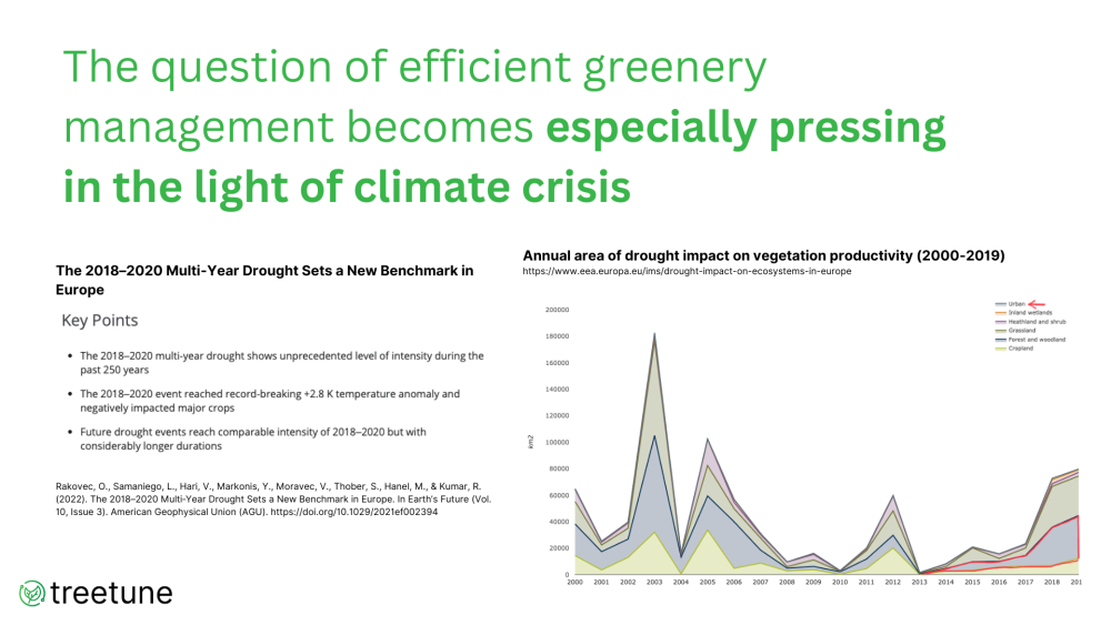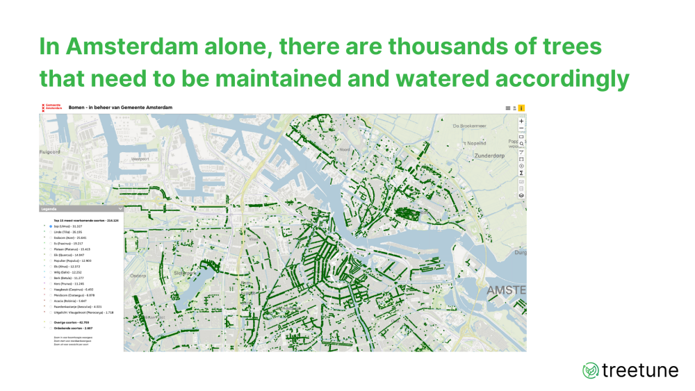 As climate change threatens the survival of green areas in cities, parks must be watered frequently. However, accurately identifying areas that require watering is difficult and requires costly sensors. Excessive watering leads to a waste of both money and clean water. Therefore, efficient and precise watering strategies are necessary to ensure the sustainability of green areas in urban environments while also conserving water resources. Check out the Amsterdam Tree Map (maps.amsterdam.nl/bomen/) to get an idea of how many trees there are in a city.
