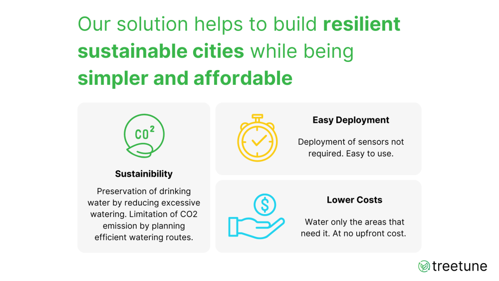 Our proposed solution is to predict soil moisture in parks using machine learning, which will eliminate the need for expensive sensors. We plan to train the algorithm on past moisture levels from both sensors and satellites, allowing for accurate and efficient prediction. This approach will provide a cost-effective and reliable solution for identifying areas that need watering in parks, which will ultimately contribute to the sustainability of green areas in urban environments and conserve water resources. See our pitch deck here: https://tinyurl.com/treetune or below!