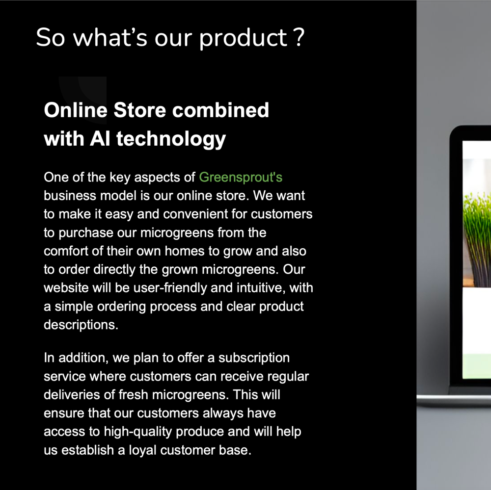 The microgreen has been gaining popularity in recent years. Our company is called "GreenSprout", which sells a variety of microgreen-related products for home growers, farmers, and chefs. GreenSprout offers a range of high-quality seeds, growing trays, soil mixes, and other growing supplies to help customers start their own microgreen gardens at home. In addition to its focus on home gardening, GreenSprout also works with farmers and chefs to supply bulk quantities of microgreens for use in restaurants, grocery stores, and other food service settings. Their product line includes a wide range of microgreens, including popular varieties such as pea shoots, sunflower greens, and wheatgrass, as well as more exotic options like shiso and mustard greens. One of GreenSprout's unique selling points is their commitment to sustainability and organic farming practices. All of the seeds are non-GMO and many are certified organic, and they use environmentally friendly growing methods that minimise waste and promote biodiversity. We also offer a smartphone app that helps customers record, monitor, and get tips about growing our microgreens. It provides educational resources and support to help customers learn how to grow and use microgreens effectively. This includes online tutorials, growing guides, and customer service support to answer any questions and troubleshoot issues. Overall, GreenSprout is a company that is dedicated to providing high-quality microgreen products and support to home growers, farmers, and chefs alike, while also prioritising sustainability and organic farming practices. Why is microgreen better than the traditional vegetables? Microgreens are often considered better than traditional vegetables in several ways. Firstly, microgreens are harvested when they are very young, usually after just a few days or weeks of growth, and are therefore more nutrient-dense than mature vegetables. Research has shown that microgreens can contain higher concentrations of vitamins, minerals, and antioxidants than their mature counterparts, making them a more nutrient-dense food choice. Secondly, microgreens are often more flavorful and tender than mature vegetables, making them a popular choice for gourmet chefs and food enthusiasts. They can add a burst of flavour and colour to dishes, and can be used in a variety of creative ways. Thirdly, microgreens are easier and quicker to grow than traditional vegetables, making them a popular choice for home gardeners who want to grow fresh produce in limited space or in urban areas. Microgreens can be grown indoors, year-round, using simple and inexpensive growing methods, and can be harvested in just a few weeks, providing a quick and satisfying gardening experience. Lastly, microgreens are more sustainable than traditional vegetables in some ways. They require less space, water, and fertiliser than mature vegetables, and can be grown using organic or hydroponic methods that minimise environmental impact. Overall, microgreens are considered better than traditional vegetables for their high nutrient density, flavour, ease of cultivation, and sustainability. However, it's important to note that mature vegetables also offer a wide range of health benefits and are an important part of a healthy diet.