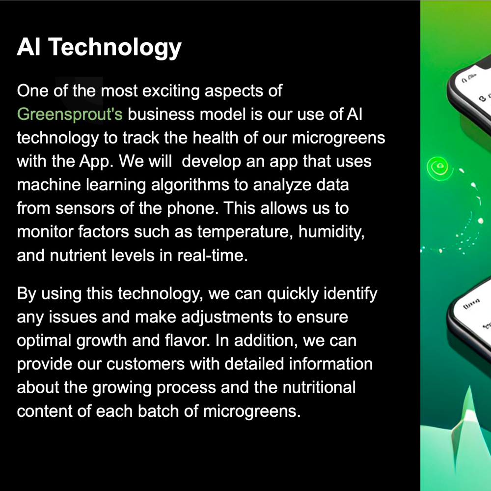The proposed startup solution is the company GreenSprout, which sells a variety of microgreen-related products for home growers, farmers, and chefs(there are rearely any companies which provide full support on the microgreens whereas we want to be the one which will help the individual or the business from start to end and also while being sustainable and less expensive) GreenSprout offers a range of high-quality seeds, growing trays, soil mixes, and other growing supplies to help customers start their own microgreen gardens at home. Additionally, GreenSprout supplies bulk quantities of microgreens for use in restaurants, grocery stores, and other food service settings. GreenSprout is unique in its commitment to sustainability and organic farming practices. We will offer a smartphone app that helps customers record, monitor, and get tips about growing microgreens, providing educational resources and support to help customers learn how to grow and use microgreens effectively.